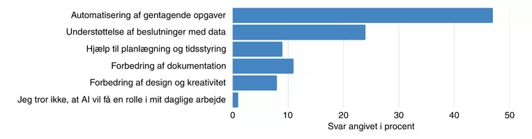 Næsten 50% af deltagerne i RIB’s undersøgelse forventer at AI først og fremmest vil blive brugt til at automatisere gentagende opgaver. Det er ikke overraskende, og for nogle er AI allerede blevet en daglig hjælpende hånd til disse typer opgaver, særligt via eksterne AI platforme. Tid er en knap ressource på langt de fleste byggeprojekter, og enhver mulighed for at effektivisere og implementere smartere og hurtigere opgaveløsning, er velkomment.