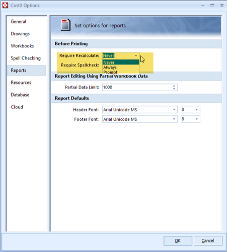 To set this up, just go to the RIB CostX Options window, select “Reports” and then change the “Require Recalculate” to Always or Prompt. Here you can also require a Spellcheck before printing a report.