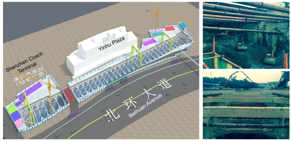 The method of cut-and-cover tunneling was applied in this project, namely, digging the trench first, roofing it with an overhead support system, and then starting the structure construction.
