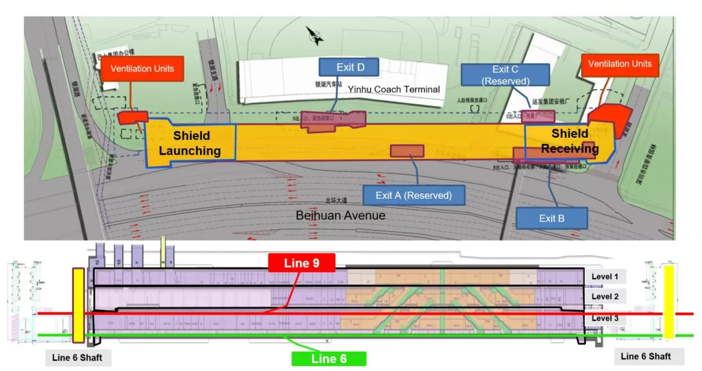 Yinhu metro station is the 13th underground station on Line 9 of Shenzhen Metro, with Line 6 crossing over, connected by its underground level 3. It sits on the side road of Beihuan Avenue, an arterial road that allows vehicles to run at a maximum speed of 80 KM/H. Immediately on the project’s north side stands Yinhu Plaza, a long-distance coach terminal, with an old automobile repair garage nearby – a four-story dilapidated building, both of which make the construction environment very challenging: the coach terminal’s regular functioning and the structure of the garage had to be secured during the construction period.